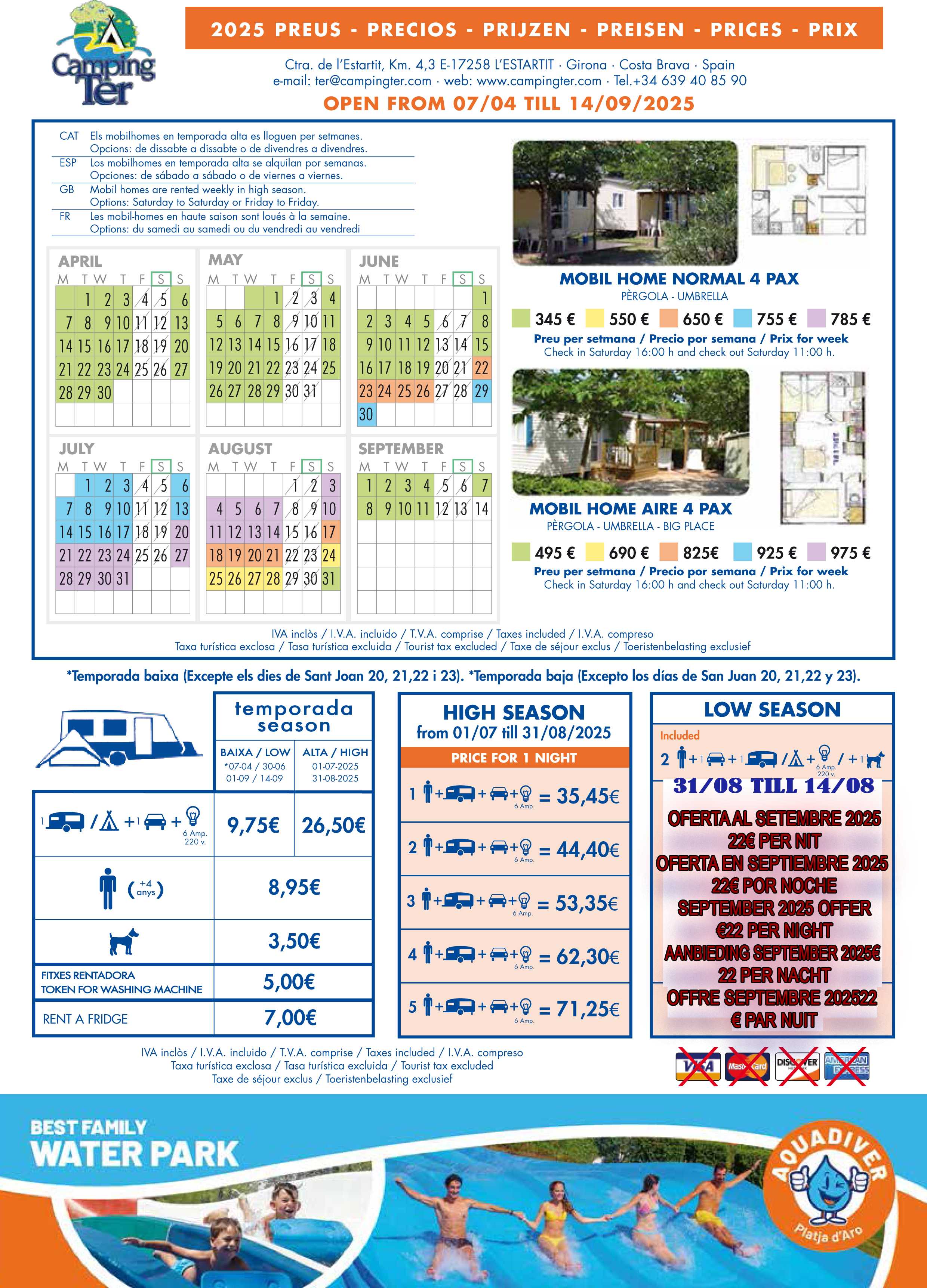 Unterkunft : Campingplatz-Mobilheim mit Luft-Mobilheim ohne Luft-Suchen Sie einen kleinen, familiären und ruhigen Campingplatz an der Costa Brava? Wir haben, was Sie suchen.Camping TER mit Mobilheimen und Bungalows, die Sie diesen Sommer an der Küste von L´Estartit mieten können.Sie fahren mit einem Wohnwagen und suchen sich einen schattigen Campingplatz mit flachem Gelände. Hier werden Sie wie mitten in der Natur sein.Besuchen Sie unseren Campingplatz und genießen Sie ein Gebiet voller Natur, wie den Naturpark Medes-Inseln und das Schloss Montgri.Unsere Region, L´Empordà Voller Sehenswürdigkeiten. Wie seine Stadt voller wunderbarer Aussichten, die uns Nordkatalonien bietet.